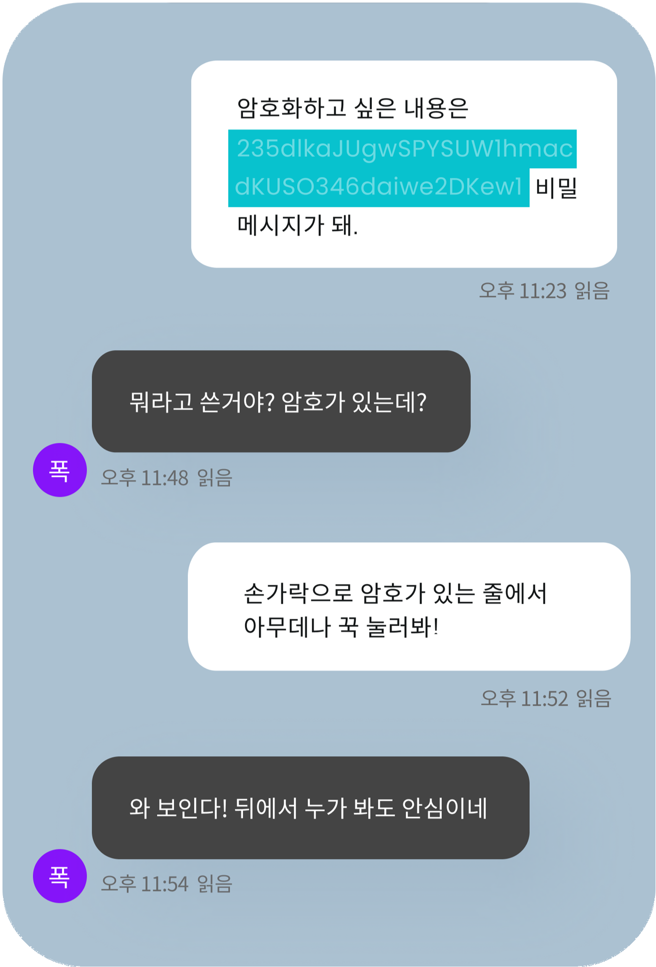 비밀 메시지와 같은 줄의 아무 곳이나 손으로 꾹 눌러보세요. 메시지 창 밖이어도 같은 줄이면 괜찮아요.